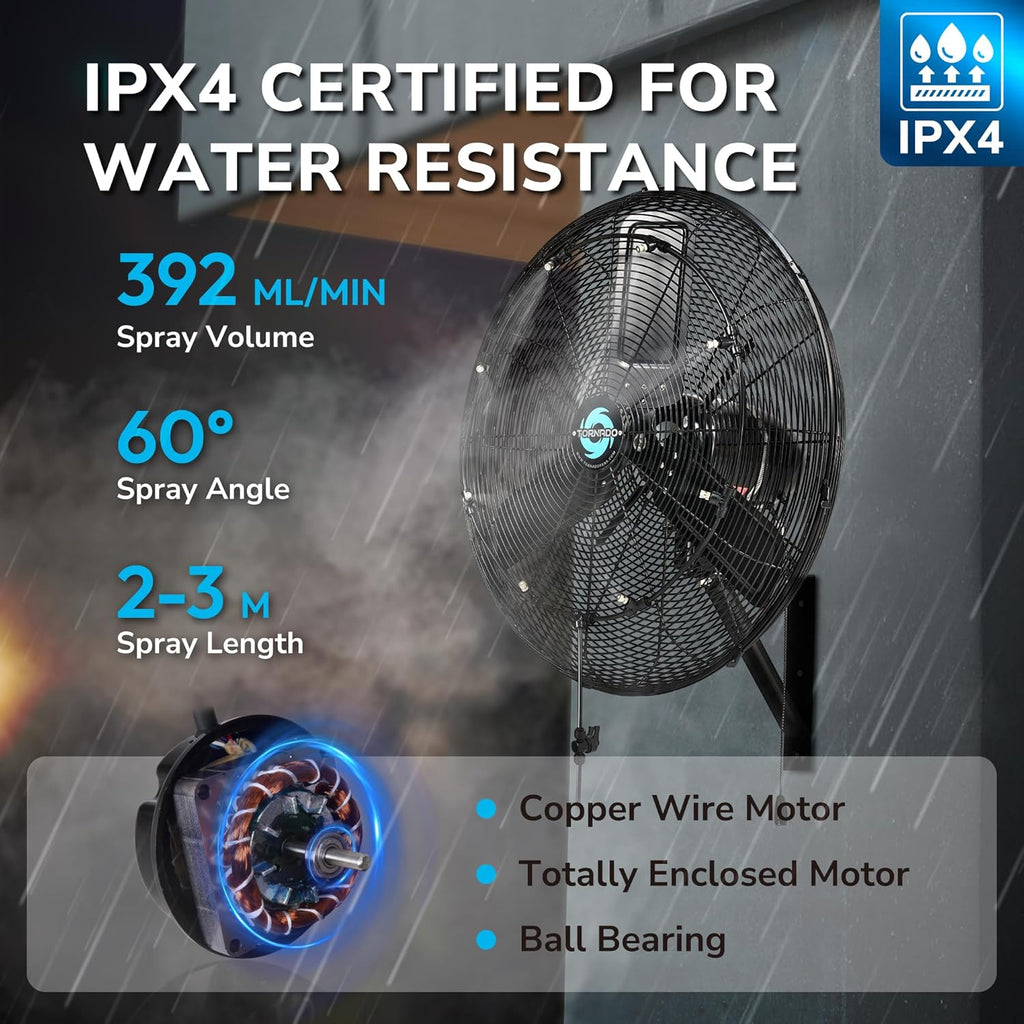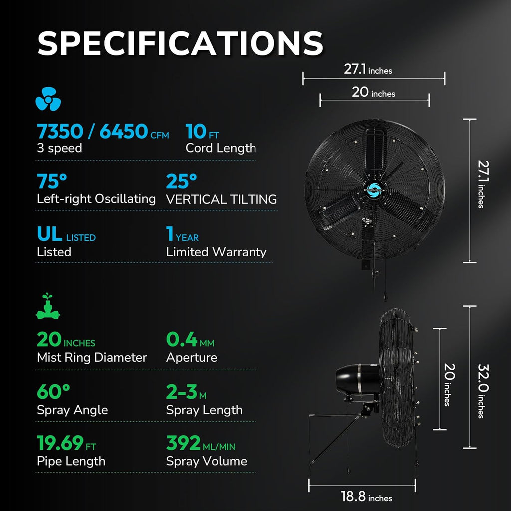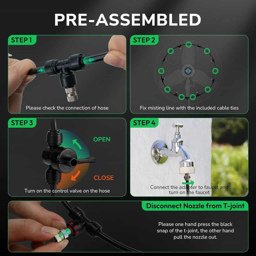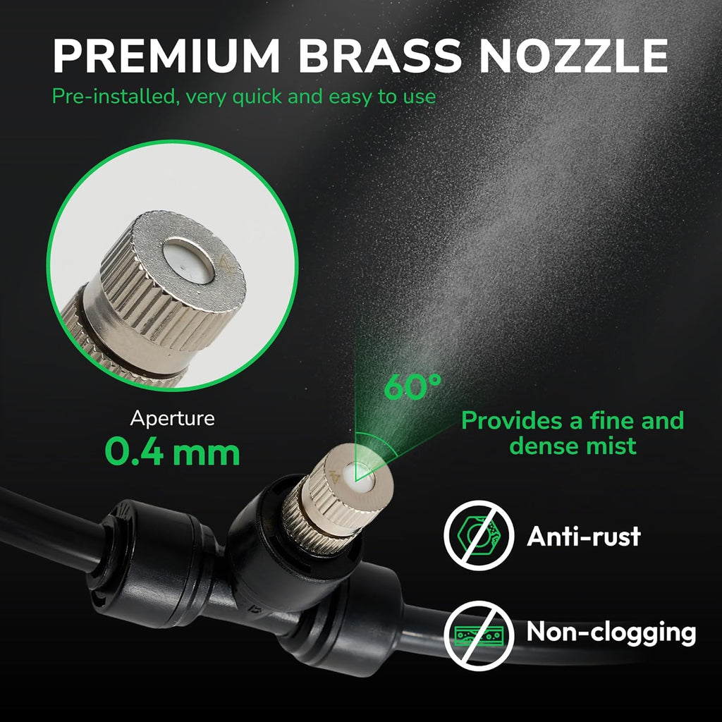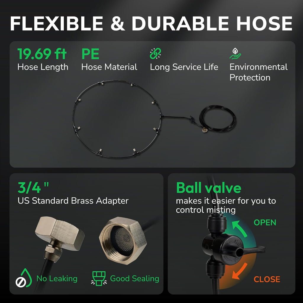 - Pre-Installed Misting Kit – Powerful Wide-Angle Cooling-Includes a factory-mounted 20” brass misting ring with 8 nozzles (plus 2 spares) for immediate use—no assembly required. Delivers a fine, consistent spray with a 60° misting angle and a coverage range of 2–3 meters. High output of 392ML/min ensures rapid cooling in even the hottest conditions.