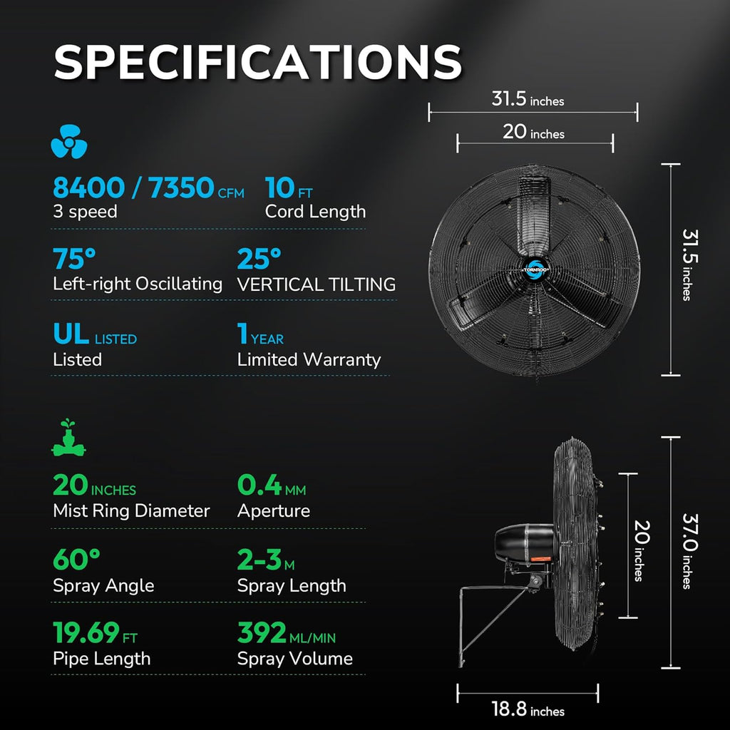 - Pre-Installed Brass Misting Kit – Immediate Cooling Coverage-Pre-installed 20” misting ring includes 8 high-quality brass nozzles (plus 2 spares), offering a consistent, fine spray. Delivers 392ML/min output at a 60° spray angle, covering up to 2–3 meters—ideal for fast cooling in heat-intensive environments.