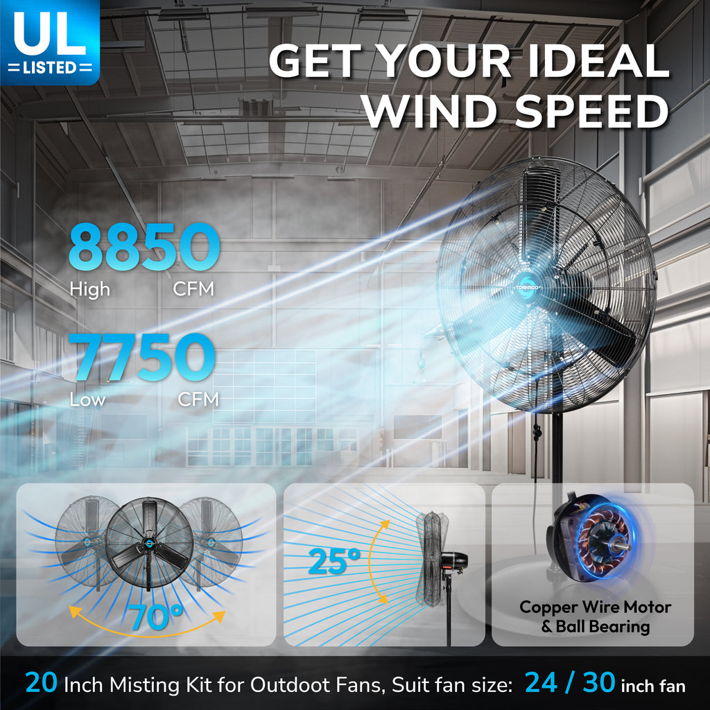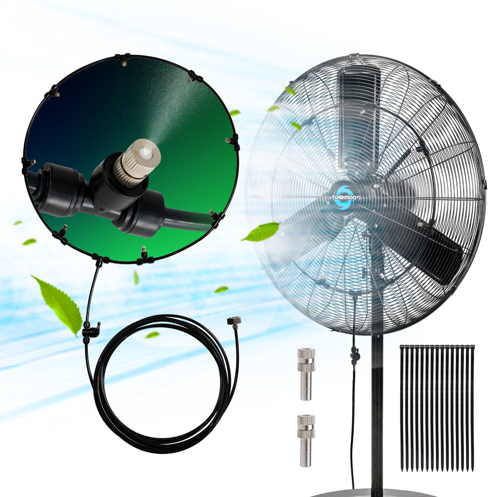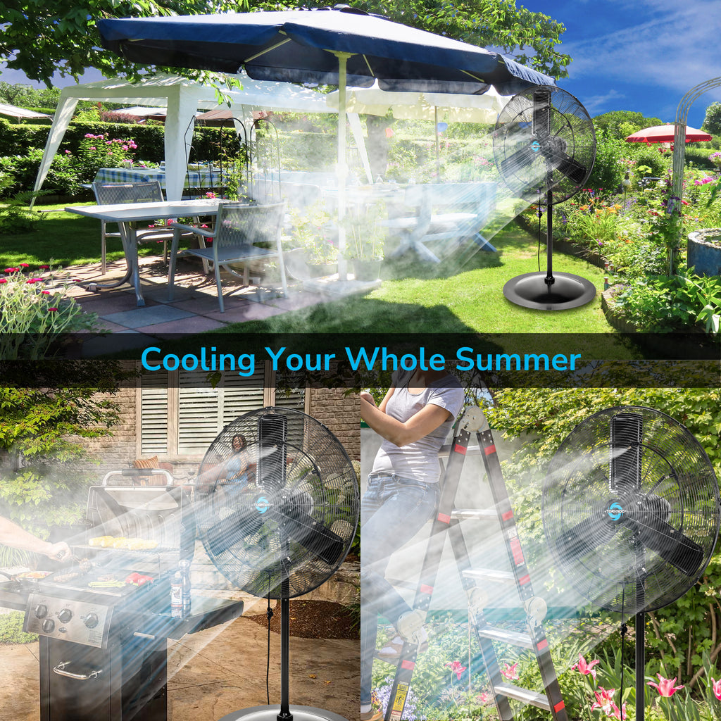 - All-in-One Outdoor Misting Cooling System – This combo includes a high-velocity 30" IPX4-rated oscillating pedestal fan and a 20" Fan Misting Kit , transforming your fan into a powerful outdoor misting system ideal for patios, warehouses, greenhouses, and backyard gatherings.